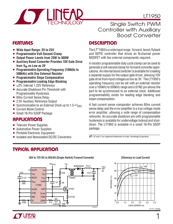 LT1950 Single Switch PWM Controller with Auxiliary Boost Converter