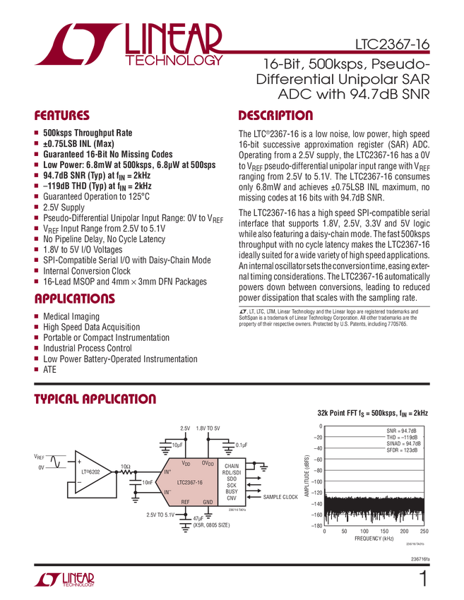 LTC2367-16 16-Bit, 500ksps, Pseudo-Differential Unipolar SAR ADC with 94.7dB SNR