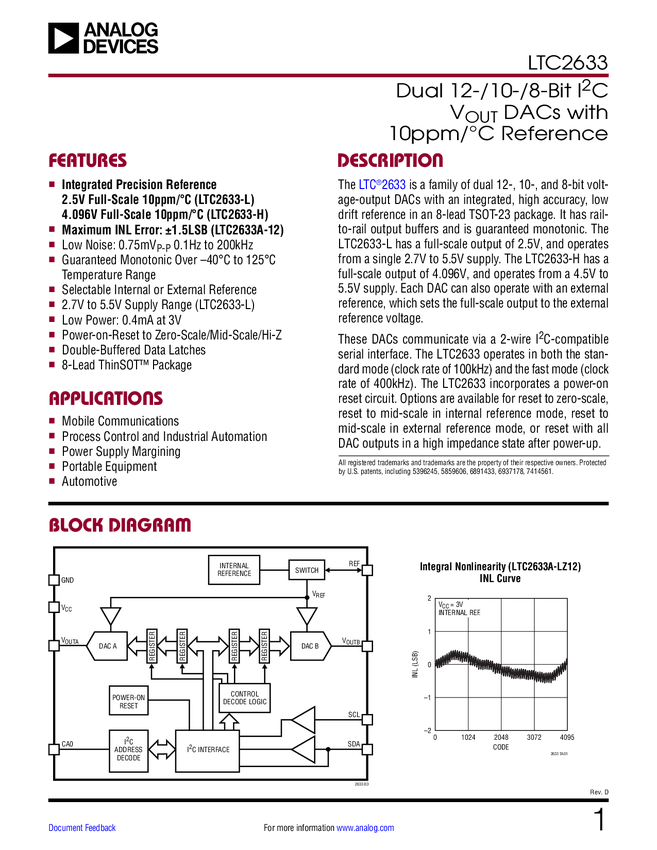 LTC2633 Dual 12-/10-/8-Bit IC V DACs with 10ppm/°C Reference