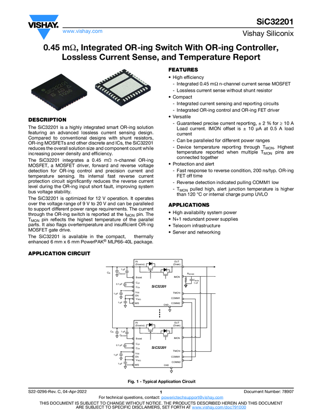 SiC32201 0.45 mΩ, Integrated OR-ing Switch With OR-ing Controller, Lossless Cur...