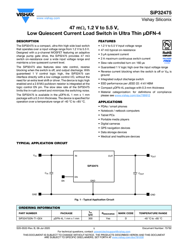 SiP32475 47 mΩ, 1.2 V to 5.5 V, Low Quiescent Current Load Switch in Ultra Thin...