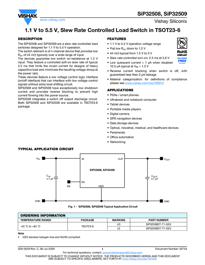 SiP32509 1.1 V to 5.5 V, Slew Rate Controlled Load Switch in TSOT23-6