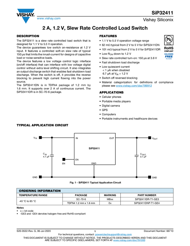 SiP32411 2 A, 1.2 V, Slew Rate Controlled Load Switch