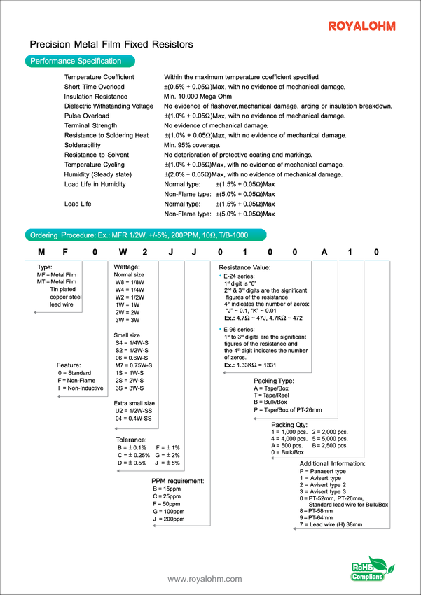Rezystor; 160kOhm; 2W; metal film; 1%; fi 5x12mm; 50ppm/*C; ROYAL OHM; MF02SFF1603A10; RoHS; opakowanie/100szt