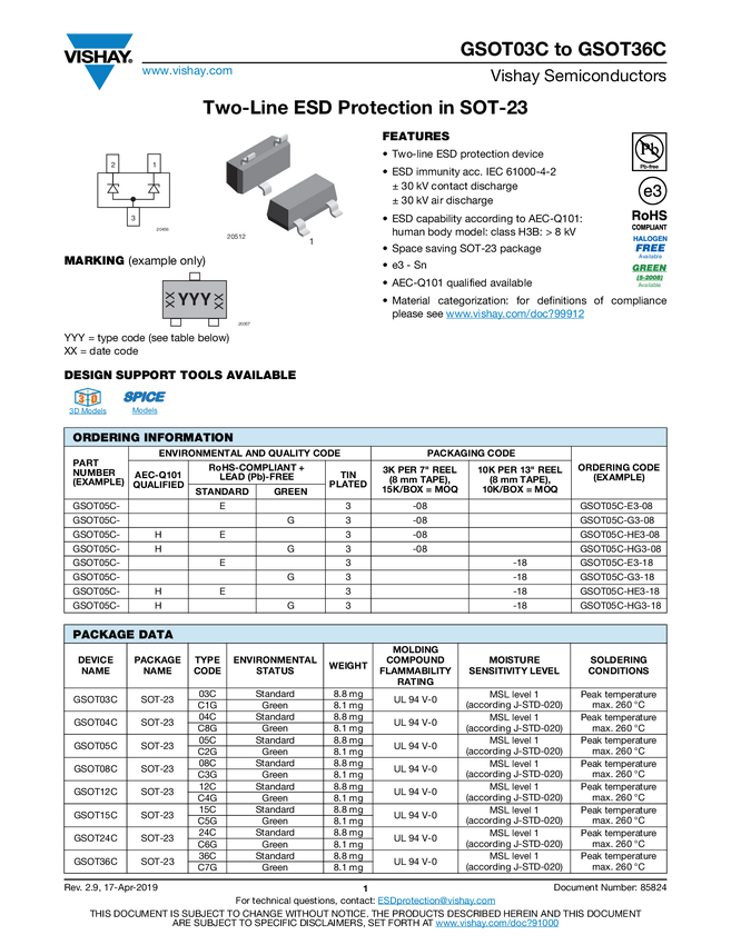 GSOT03C to GSOT36C Two-Line ESD Protection in SOT-23