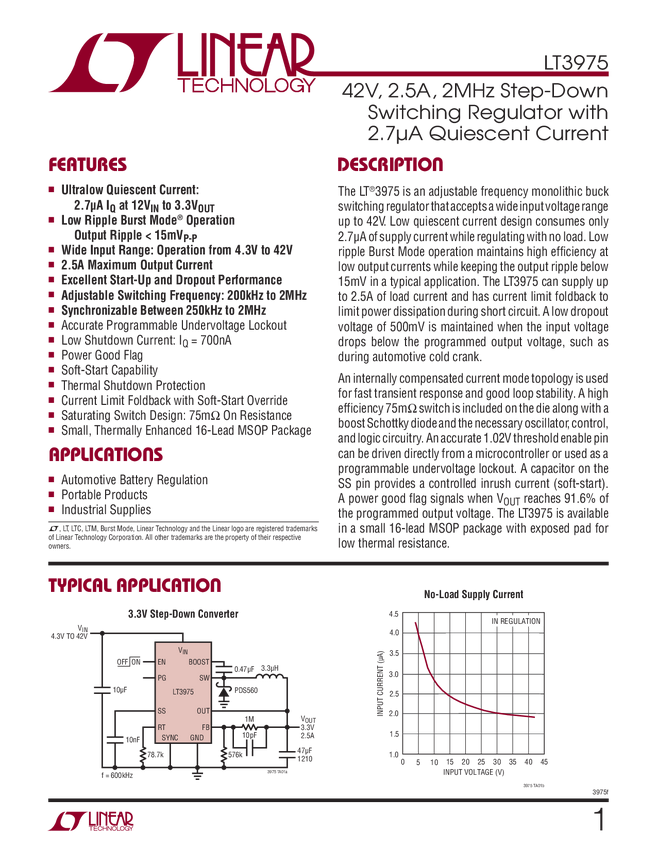 LT3975 42V, 2.5A, 2MHz Step-Down Switching Regulator with 2.7µA Quiescent Current