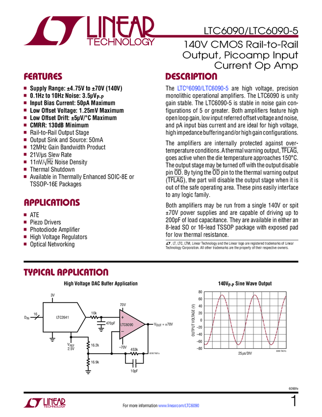 LTC6090 LTC6090-5 140V CMOS Rail-to-Rail Output, Picoamp Input Current Op Amp