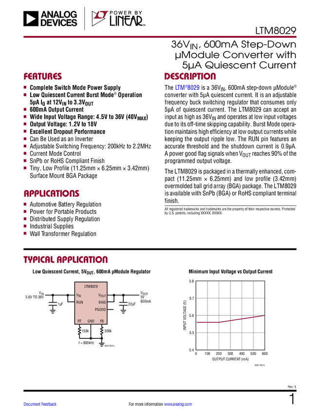 LTM8029 36V, 600mA Step-Down μModule (Power Module) Converter with 5μA Quiescent Cu...