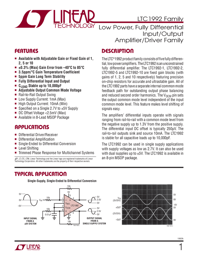 LTC1992 Family Low Power, Fully Differential Input/Output Amplifier/Driver Family