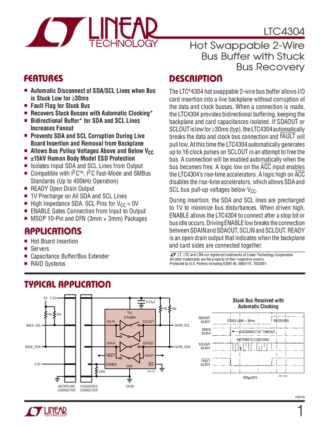 LTC4304 Hot Swappable 2-Wire Bus Buffer with Stuck Bus Recovery