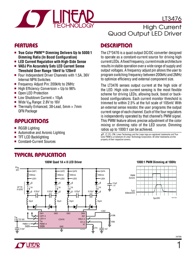 LT3476 High Current Quad Output LED Driver
