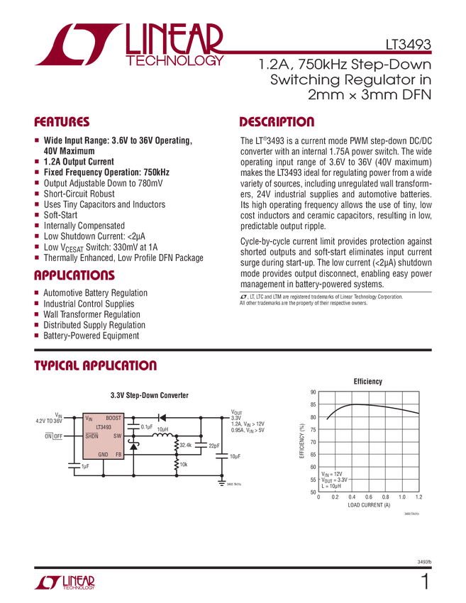 LT3493 1.2A, 750kHz Step-Down Switching Regulator in 2mm × 3mm DFN