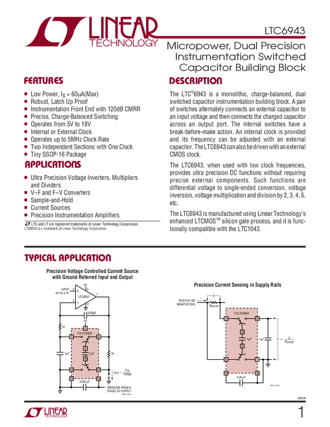 LTC6943 Micropower, Dual Precision Instrumentation Switched Capacitor Building Bloc...