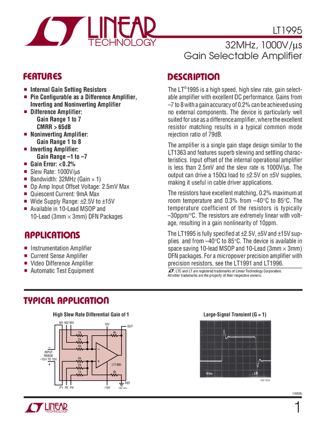 LT1995 32MHz, 1000V/µs Gain Selectable Amplifier