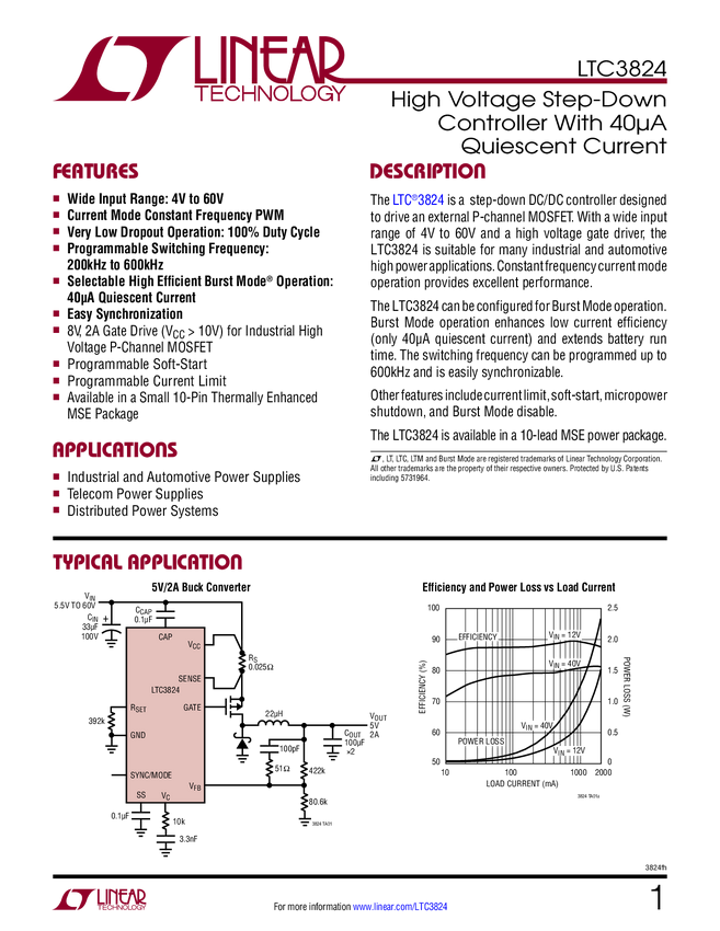 LTC3824 High Voltage Step-Down Controller With 40µA Quiescent Current