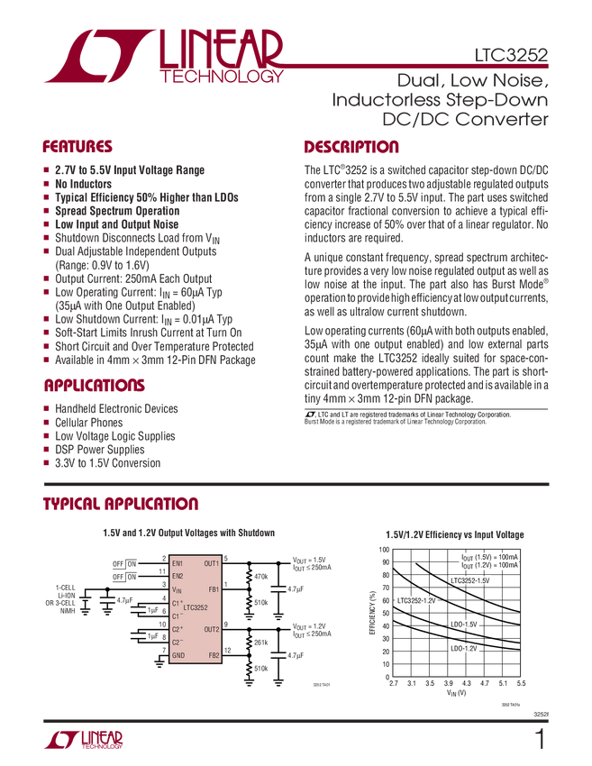 LTC3252 Dual, Low Noise, Inductorless Step-Down DC/DC Converter