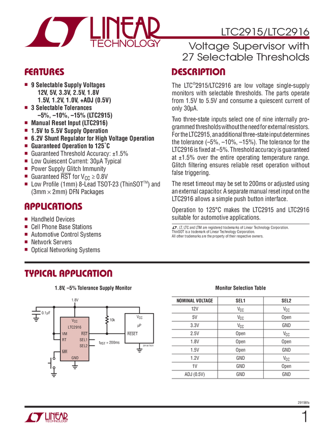 LTC2916 Voltage Supervisor with 9 Selectable Thresholds and Manual Reset Input