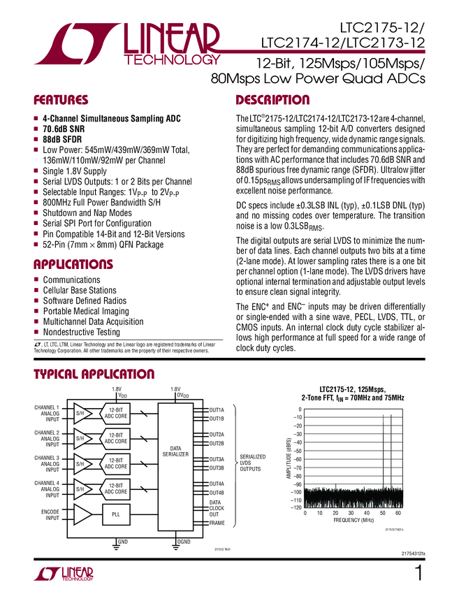 LTC2175-12 12-Bit, 80Msps Low Power Quad ADCs