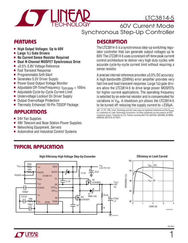 LTC3814-5 60V Current Mode Synchronous Step-Up Controller