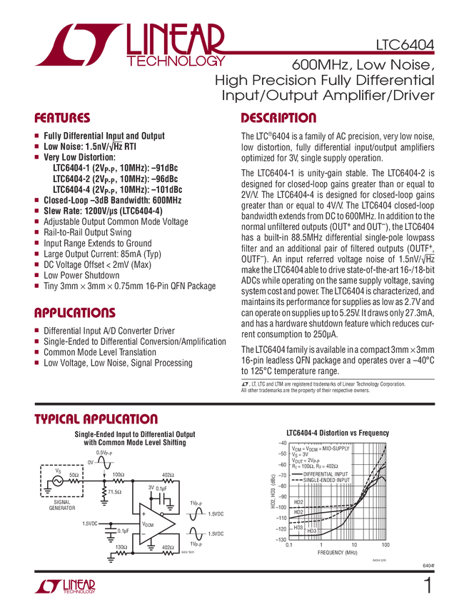 LTC6404 600MHz, Low Noise, High Precision Fully Differential Input/Output Amplifier/...
