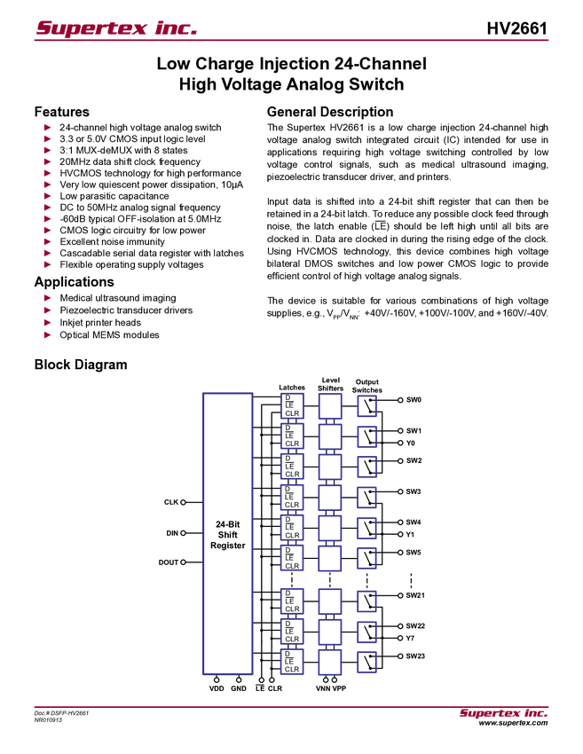 HV2661 Datasheet - Low Charge Injection, 24-Channel, HV Analog Switch