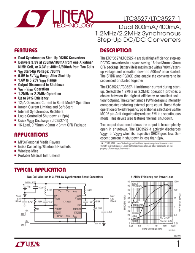 LTC3527 Dual 800mA/400mA, 1.2MHz/2.2MHz Synchronous Step-Up DC/DC Converters