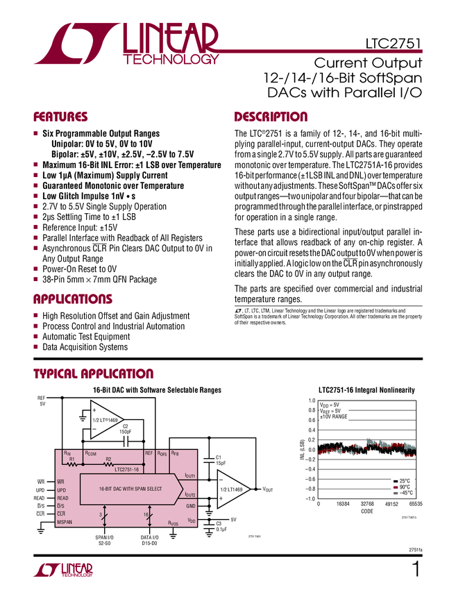 LTC2751 Current Output 12-/14-/16-Bit SoftSpan DACs with Parallel I/O