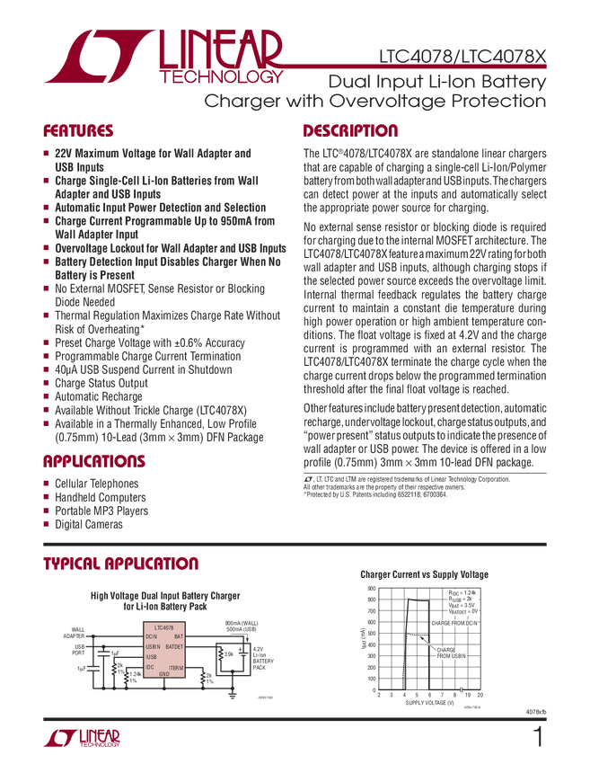 LTC4078LTC4078X Dual Input Li-Ion Battery Charger with Overvoltage Protection