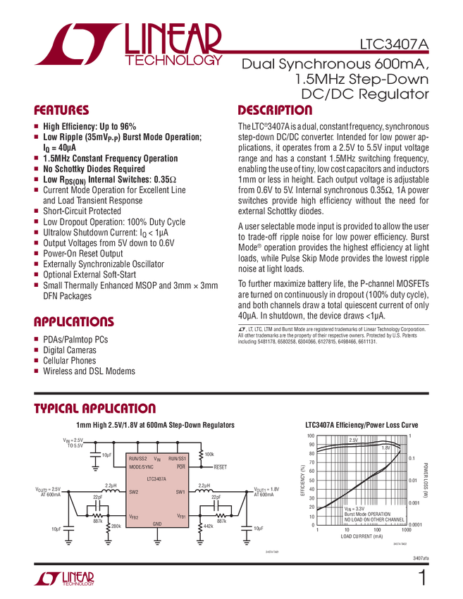 LTC3407A Dual Synchronous 600mA, 1.5MHz Step-Down DC/DC Regulator