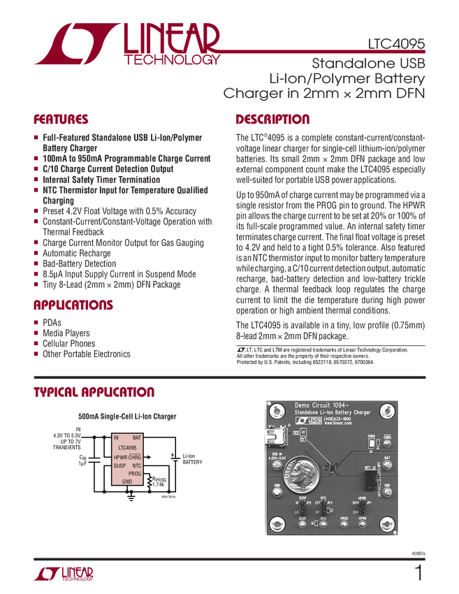 LTC4095 Standalone USB Li-Ion/Polymer Battery Charger in 2mm x 2mm DFN