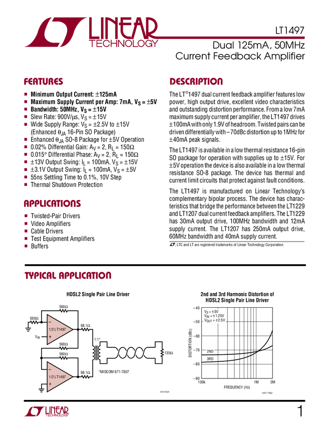 LT1497 Dual 125mA, 50MHz Current Feedback Amplifier