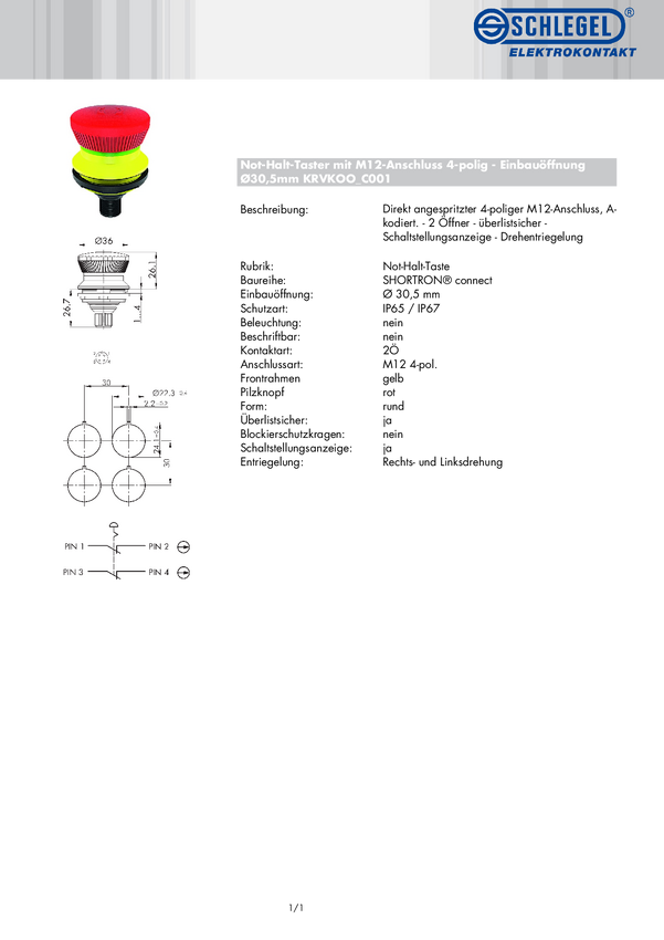 KRVKOO_C001 Wyłącznik awaryjny, grzybkowy Schlegel KRVKOO_C001, 2 NC, 1 szt.