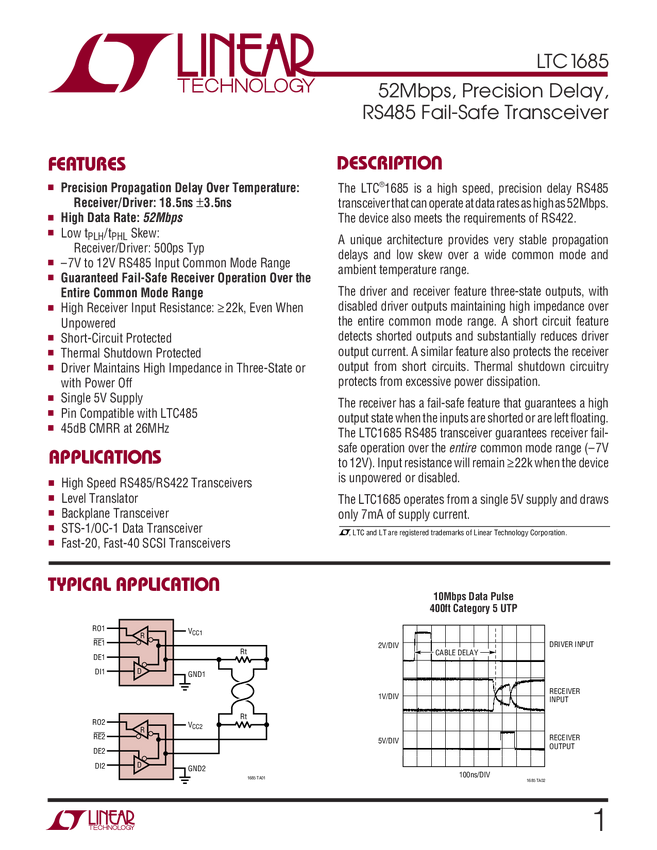 LTC1685 52Mbps, Precision Delay, RS485 Fail-Safe Transceiver
