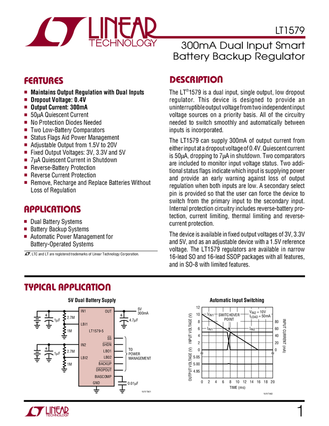 LT1579 300mA Dual Input Smart Battery Backup Regulator