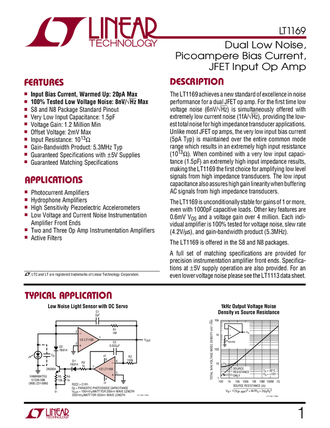 LT1169 Dual Low Noise, Picoampere Bias Current, JFET Input Op Amp