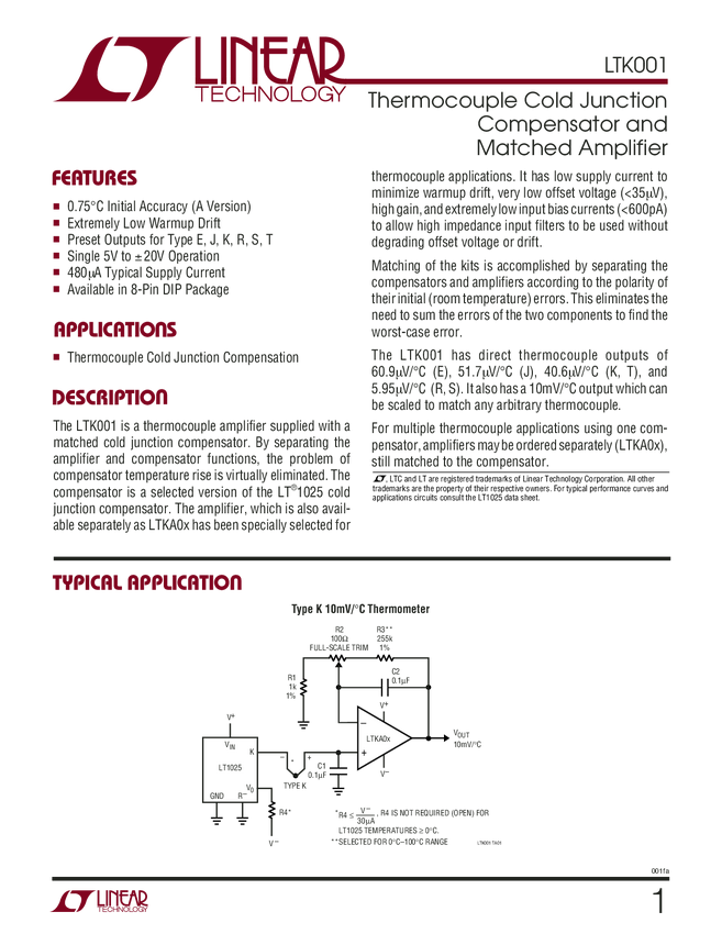 LTK001 Thermocouple Cold Junction Compensator and Matched Amplifier