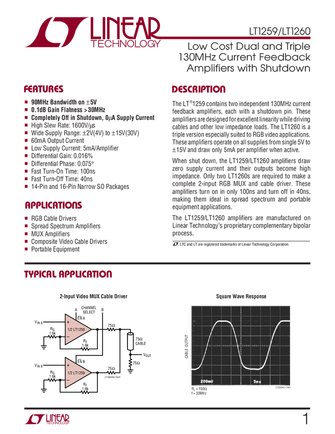 LT1260 Low Cost Dual and Triple 130MHz Current Feedback Amplifiers with Shutdown
