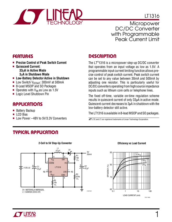 LT1316 Micropower DC/DC Converter with Programmable Peak Current Limit
