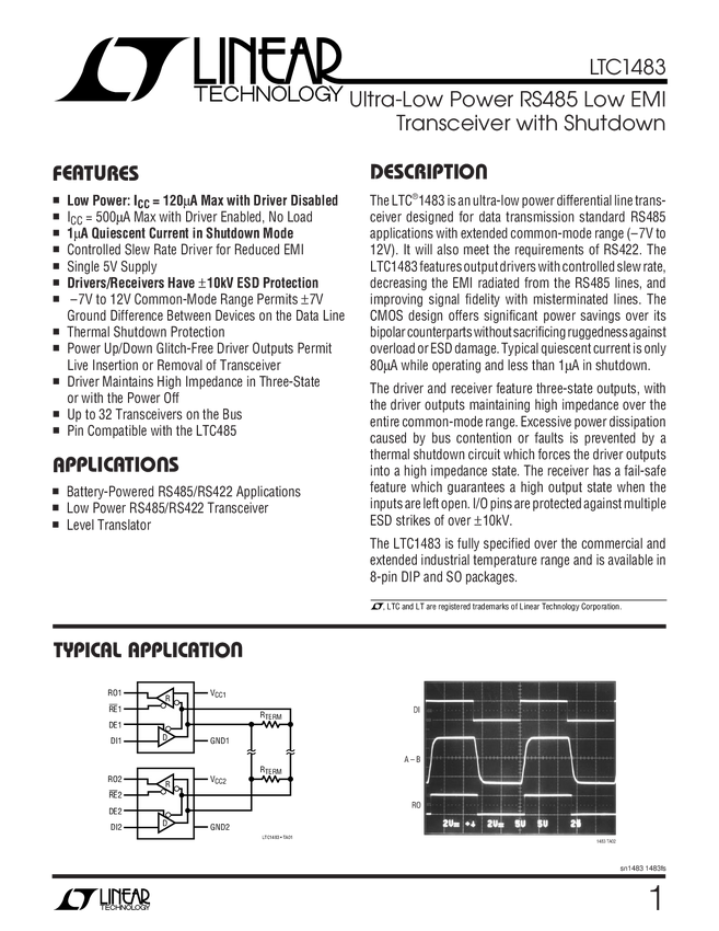LTC1483 Ultra-Low Power RS485 Low EMI Transceiver with Shutdown