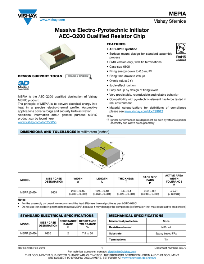 MEPIA Massive Electro-Pyrotechnic Initiator AEC-Q200 Qualified Resistor Chip