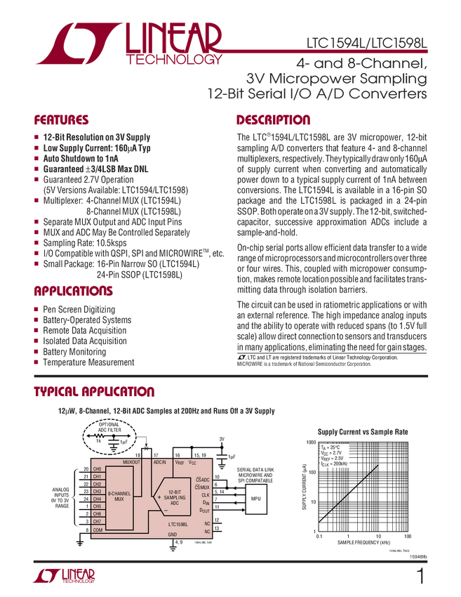 LTC1594L 4- and 8-Channel, 3V Micropower Sampling 12-Bit Serial I/O A/D Converters