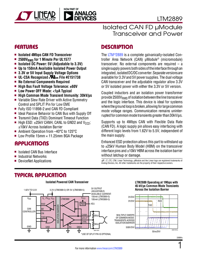 LTM2889 Isolated CAN FD µModule Transceiver and Power