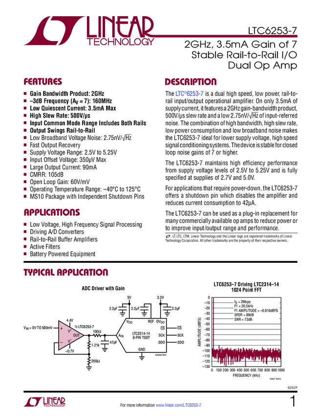LTC6253-7 2GHz, 3.5mA Gain of 7 Stable Rail-to-Rail I/O Dual Op Amp