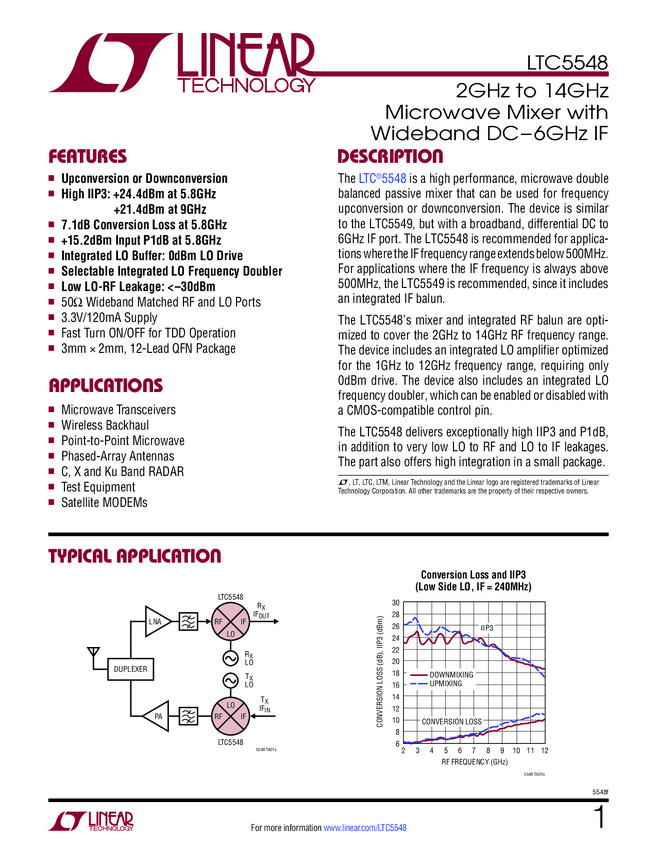LTC5548 2GHz to 14GHz Microwave Mixer with Wideband DC–6GHz IF