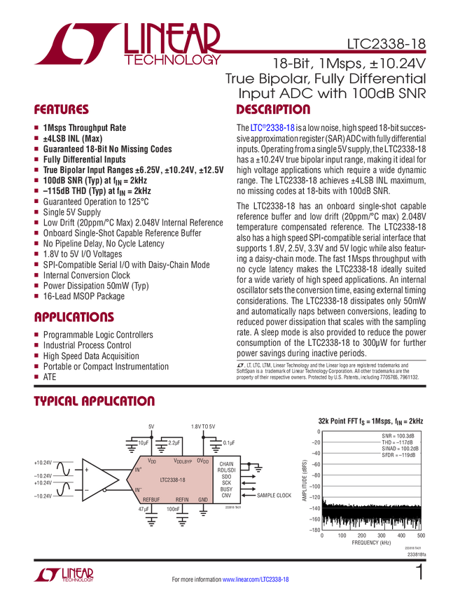 18-Bit, 1Msps, ±10.24V True Bipolar, Fully Differential Input ADC with 100dB SNR