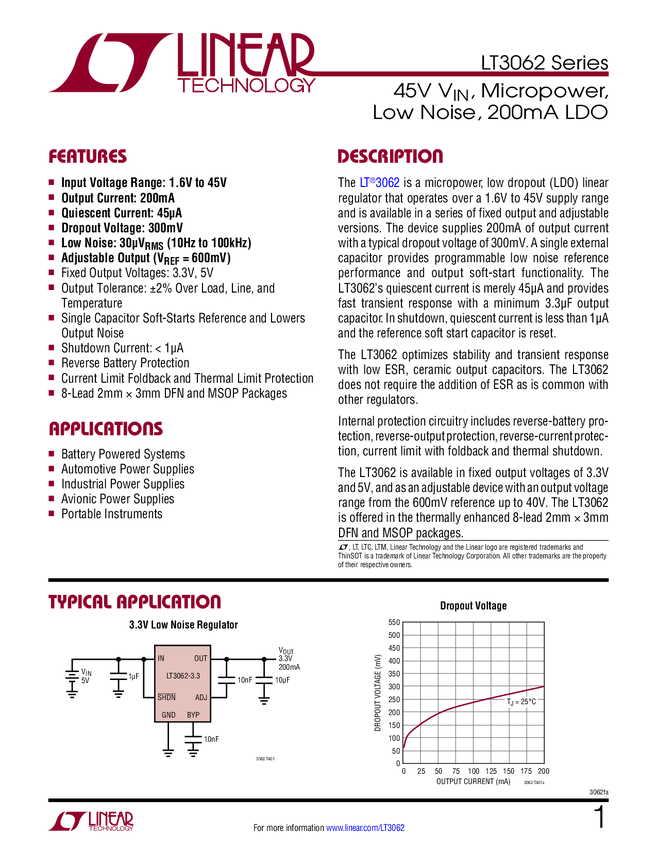 LT3062 45V V, Micropower, Low Noise, 200mA LDO