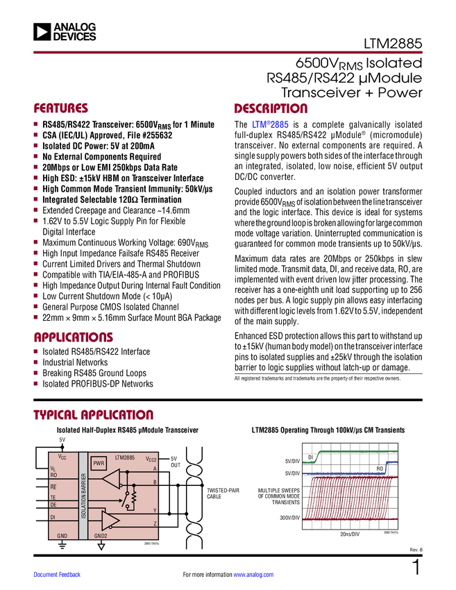 LTM2885 6500V Isolated RS485/RS422 μModule Transceiver + Power