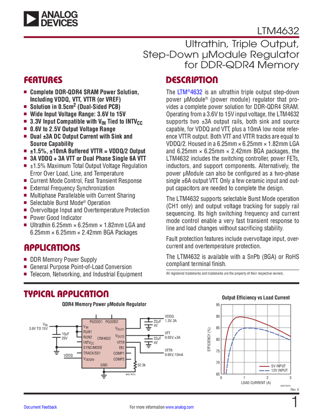 LTM4632 Ultrathin, Triple Output, Step-Down μModule Regulator for DDR-QDR4 Memory