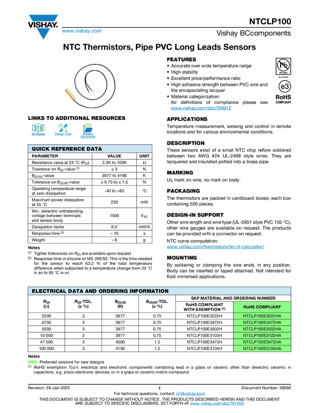 NTCLP100 NTC Thermistors, Pipe PVC Long Leads Sensors