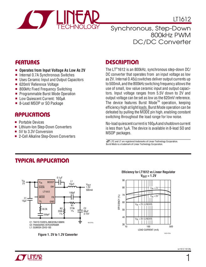 LT1612 Synchronous, Step-Down 800kHz PWM DC/DC Converter